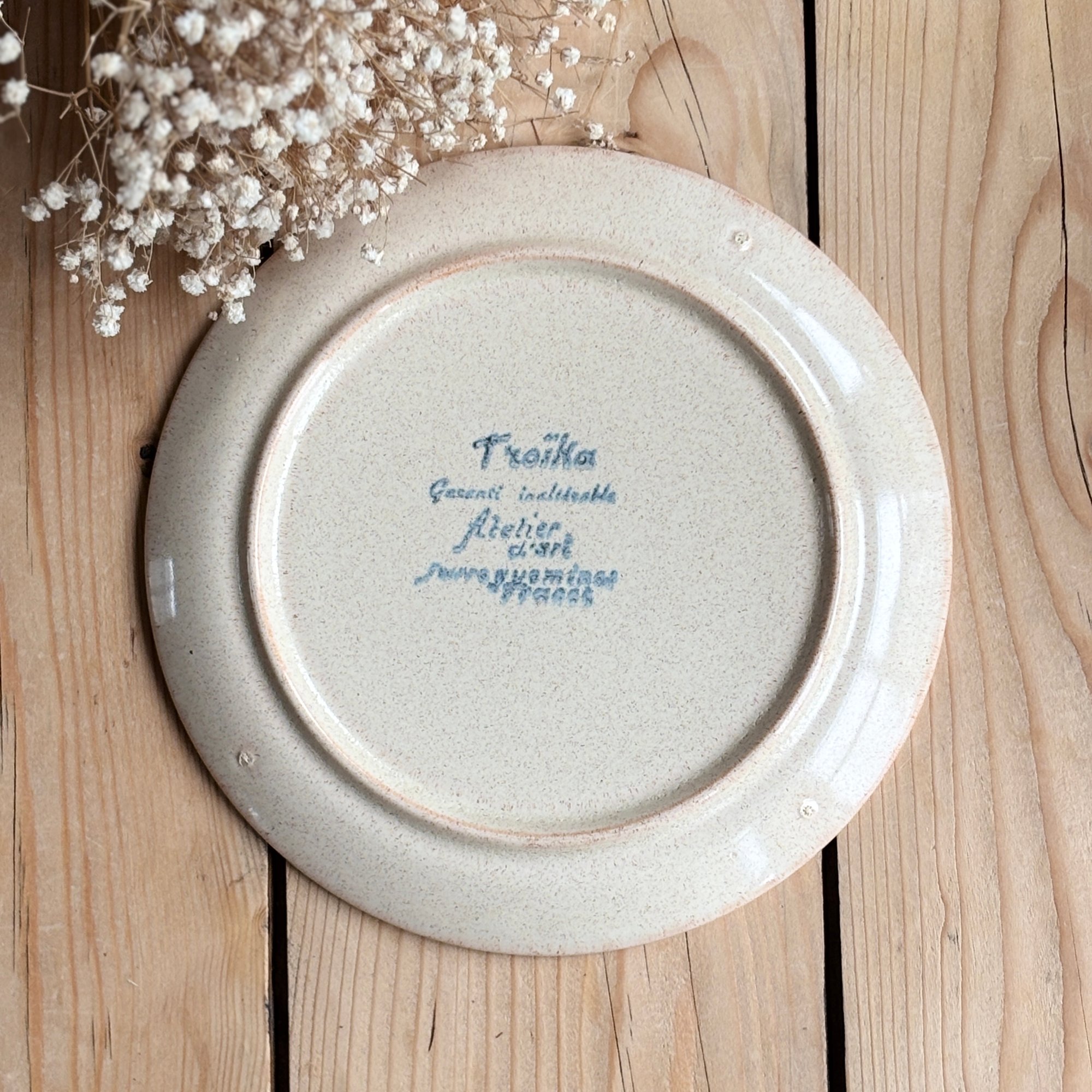 Assiette à dessert en faïence et peintes à la main estampillée ATELIER D’ART SARREGUEMINES, modèle « Troïka ». Garanti inaltérable.