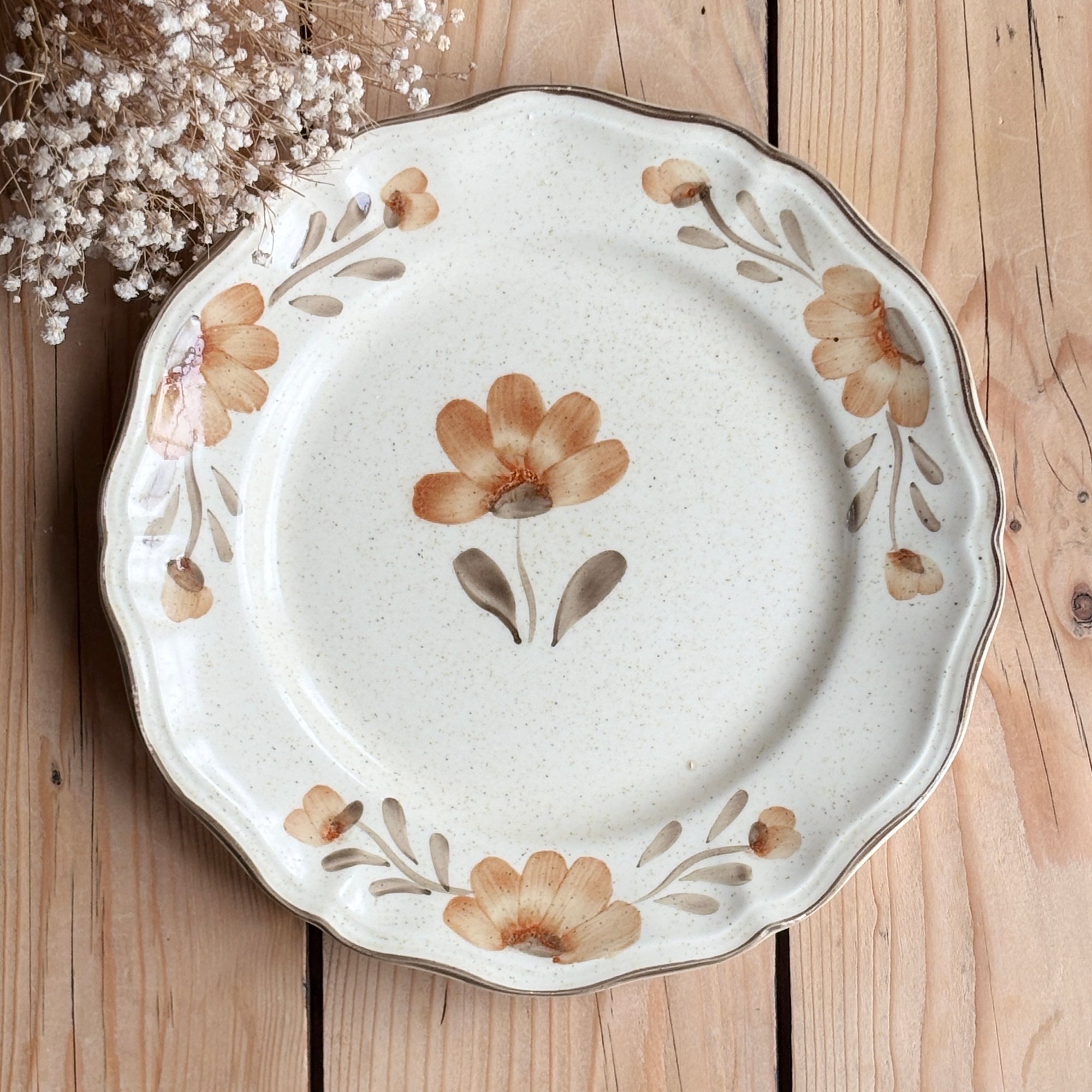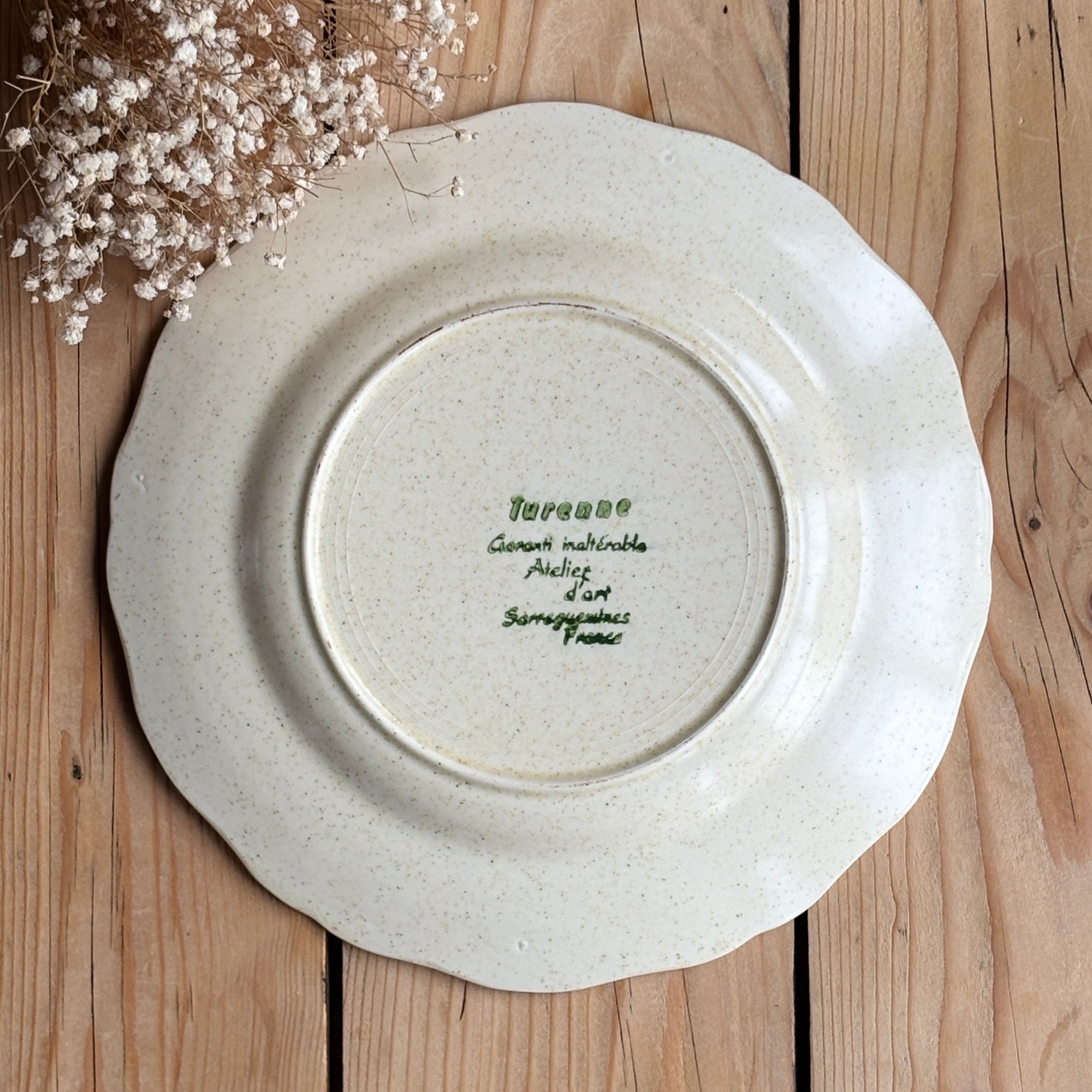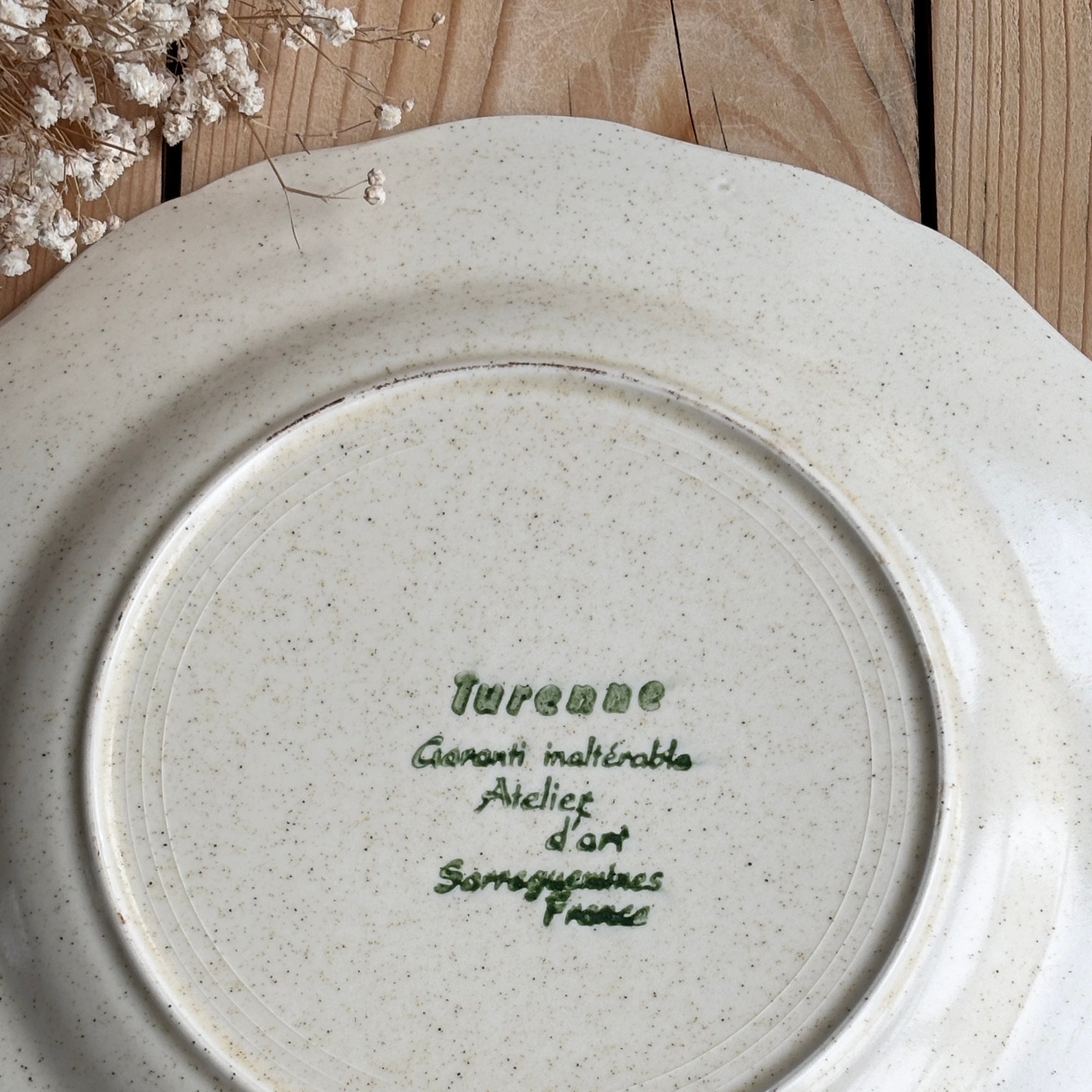 Assiette plate en faïence et peinte à la main de estampillée ATELIER D’ART SARREGUEMINES, modèle «Turenne ».